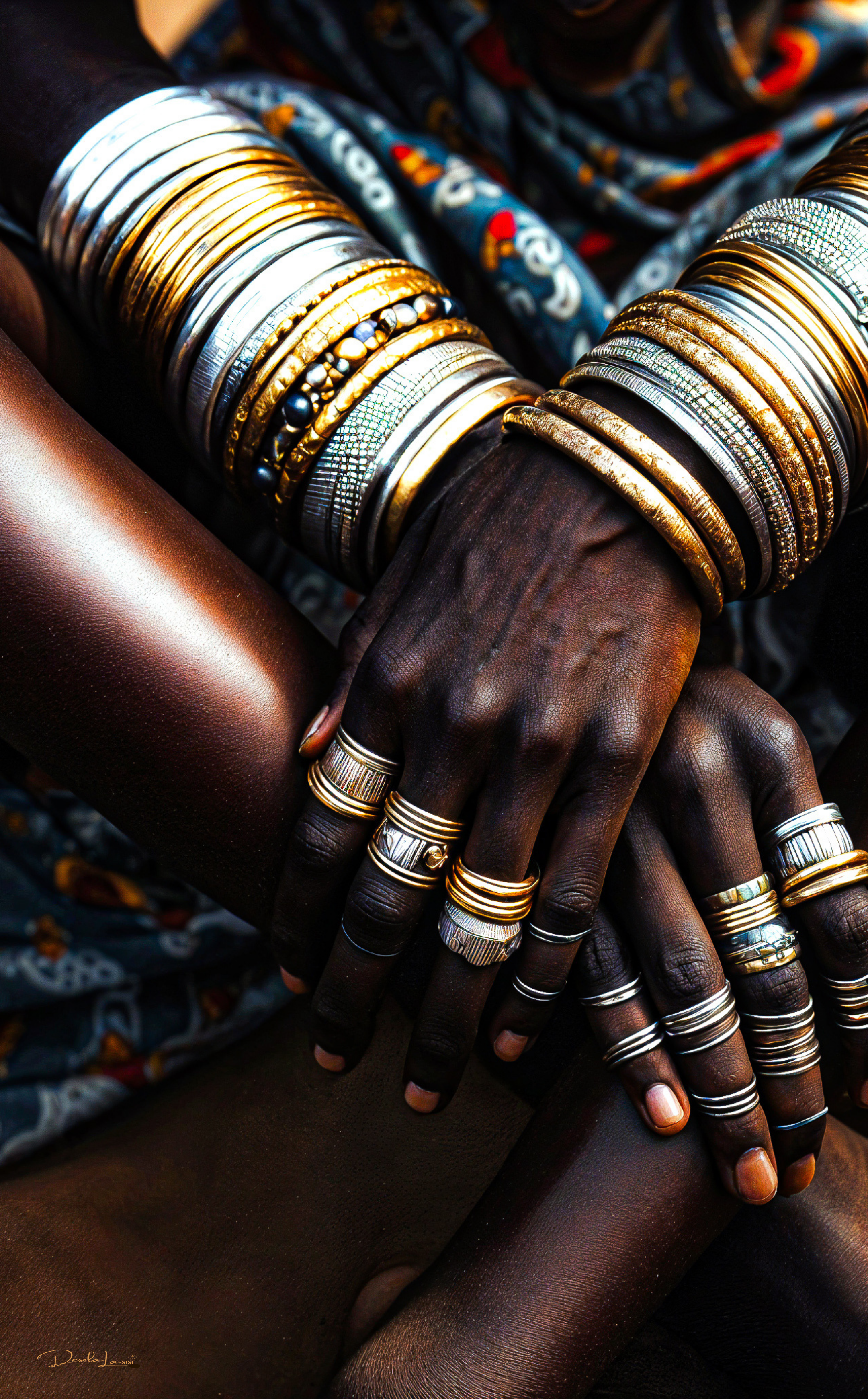 The contrast between the dark skin of the subjects and the bright, shiny jewelry creates a striking visual impact, emphasizing the elegance and strength of African women. The collection not only celebrates the beauty of the wearers but also their identity and cultural heritage. Traditional patterns and symbols in the jewelry pieces speak to the rich cultural heritage of Africa, adding depth and layers of meaning to each photograph.