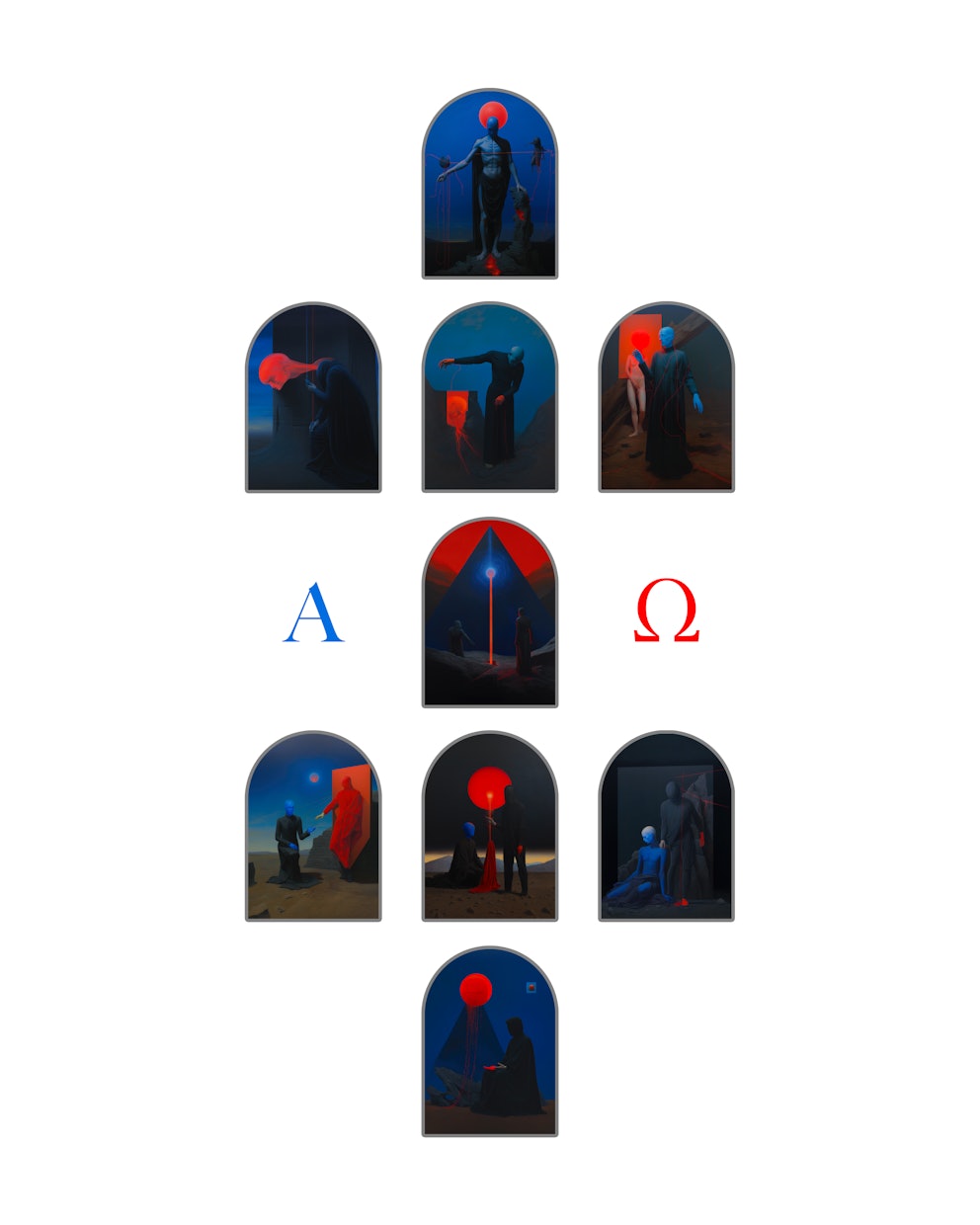 This surrealist ennealogy, a testament told over 9 works, expresses the internal battle and eventual transition between physical ego and ethereal self.