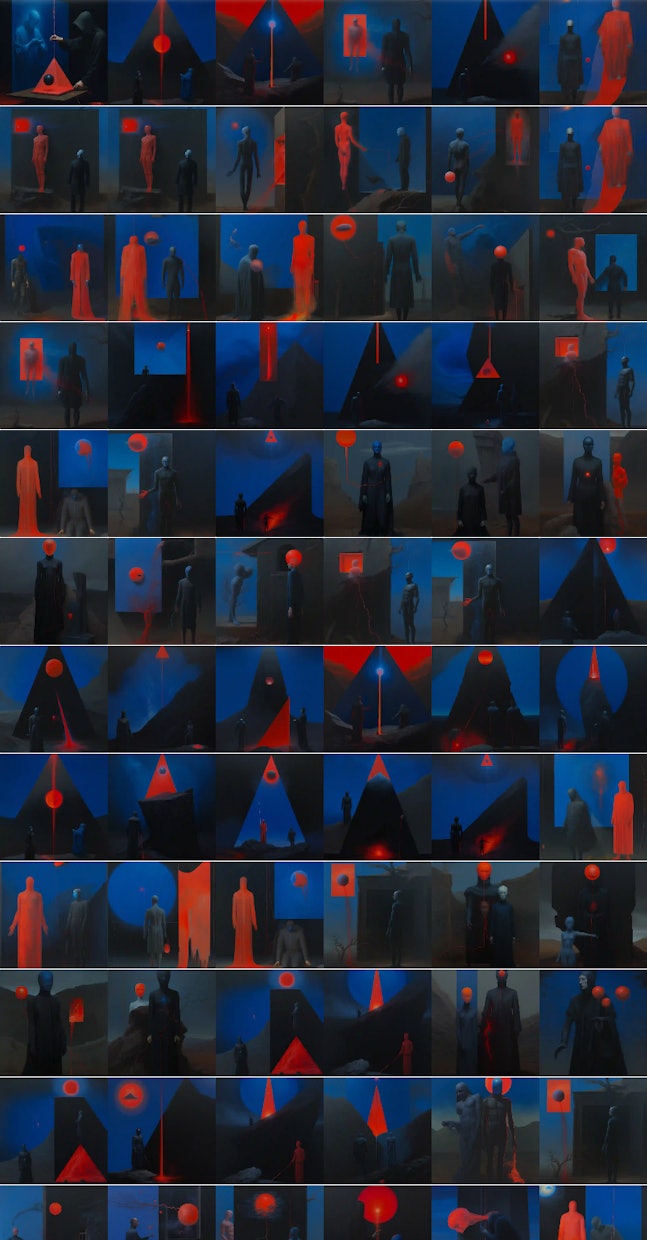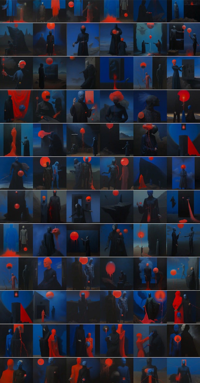 After the curation phase, I focused on individual works, and began in-painting, expanding, and adjusting compositions. Sometimes this happens over hundreds of iterations for each individual work.