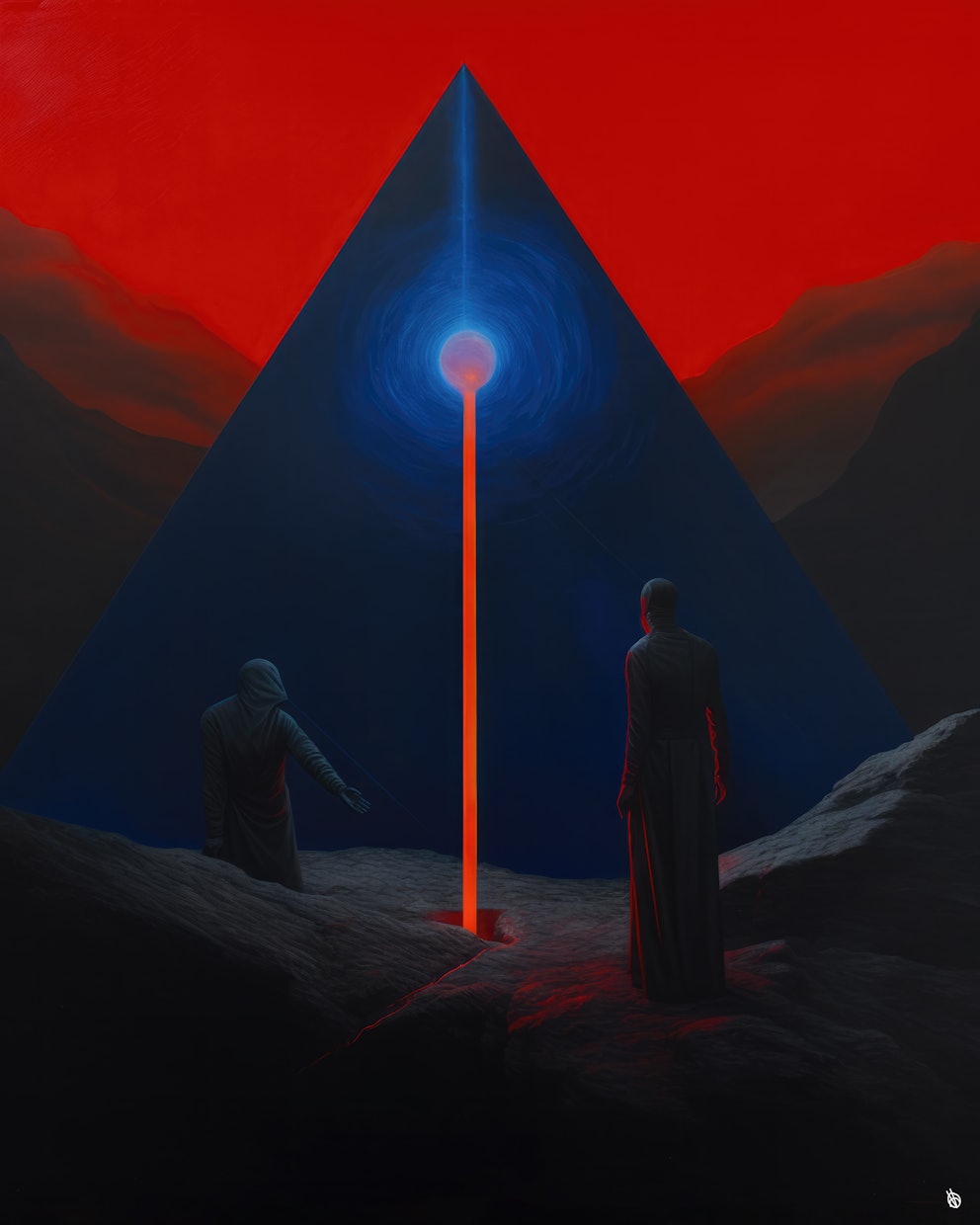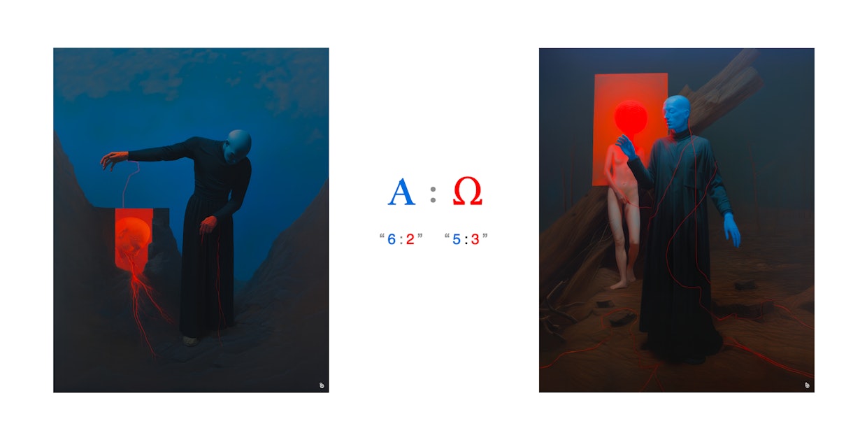 The foundational components of A:Ω was created with AI. I developed multiple custom style tune models from my own work, combined with prompted outputs. I then created 1000's of compositions using these tune models with scene prompts, finally curating down to a list of about 75 or so initial compositions that sync with my intention for the collection.