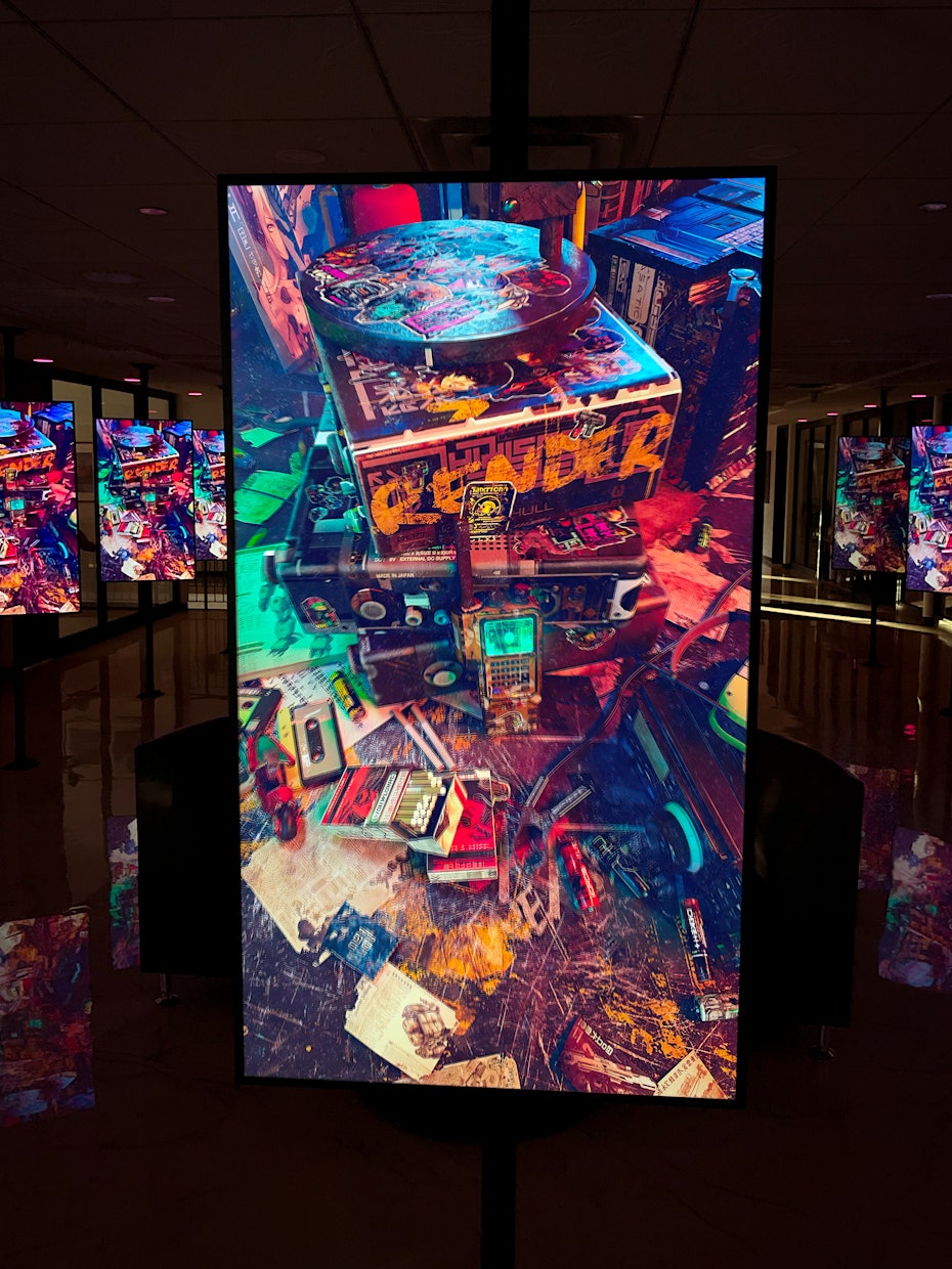 "Watchers Desk" immerses viewers in a dystopian, cyberpunk workspace, rich with intricate details and vibrant colors. The cluttered desk, filled with futuristic gadgets, stickers, and retro elements, tells a story of a vigilant watcher deeply engrossed in their world. Each item, from the vintage cassettes to the advanced tech devices, is meticulously crafted, highlighting Atmo's expertise in combining 2D and 3D elements.
